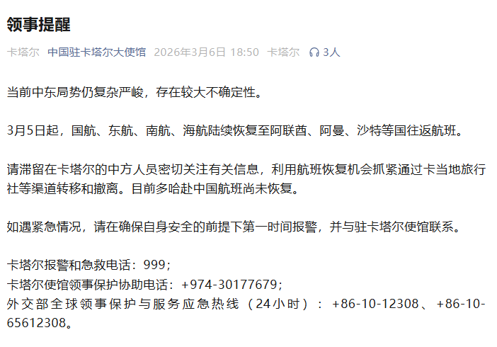 新京报讯据中国驻卡塔尔大使馆微信公众号消息,当前中东局势仍复杂严峻,存在较大不确定性。