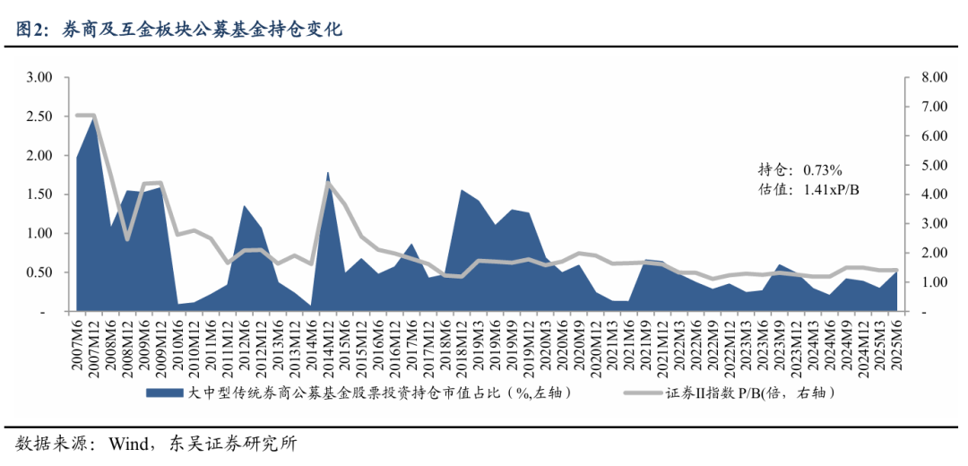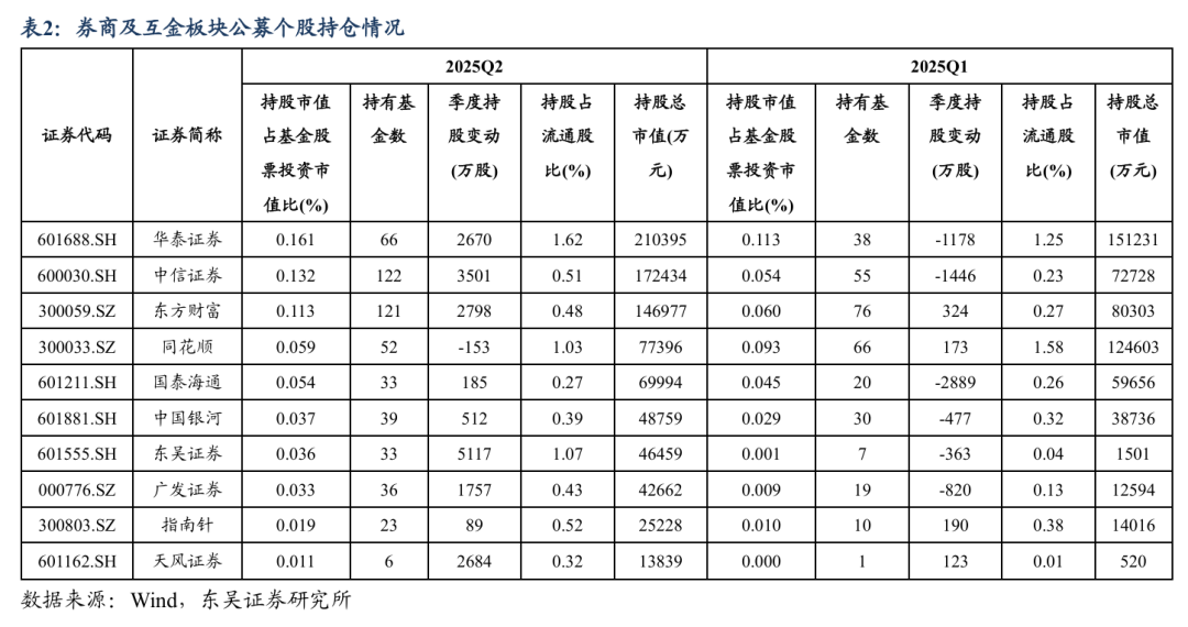券商及互金板块获大面积增持,板块估值环比25Q1小幅提升:1)券商及互金板块整体:截至2025年上半年末,公募基金股票投资中券商及互金板块持仓0.73%,较2025年一季度末增加0.26个百分点,同比增加0.43个百分点。其中传统券商持仓占比0.53%,较2025年一季度末增加0.23个百分点,同比增加0.32个百分点。2025年上半年末券商行业(中信II指数)估值为1.41xP/B(静态),2025年一季度末为1.4xP/B。2)互金标的:东方财富持仓占比0.11%,较2025年一季度末增加0.05个百分点,同比增加0.05个百分点;同花顺持仓占比0.06%,较2025年一季度末减少0.03个百分点,同比增加0.04个百分点。3)传统中大型券商:截至2025年上半年末,公募基金大中型券商持仓为0.5%,较2025年一季度末增加0.21个百分点,同比增加0.3个百分点。传统券商中,机构持仓仍集中在大中型券商。大中型券商中,中信、华泰、国泰海通、银河、广发、申万宏源、东吴、兴业、光大、东方获机构增持,中信建投、招商、浙商、国信遭减持。