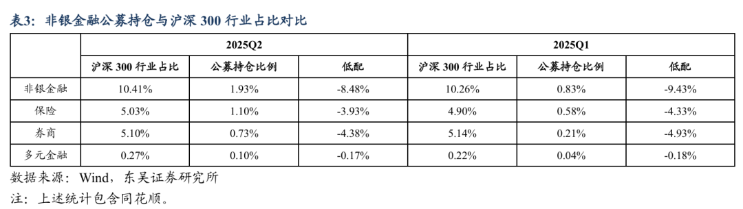 ]article_adlist-->事件:2025年公募基金二季报发布完毕,2025年二季度末公募基金股票投资中非银金融行业总持仓1.93%(含同花顺),环比2025Q1提升1.10pct。相比沪深300行业流通市值占比低配8.48pct,环比2025Q1低配幅度收窄0.95pct。个股方面,非银行业前五大重仓股为中国平安、中国太保、华泰证券、中信证券和新华保险,持仓市值分别为77.59亿元、40.71亿元、21.04亿元、17.24亿元、15.97亿元。