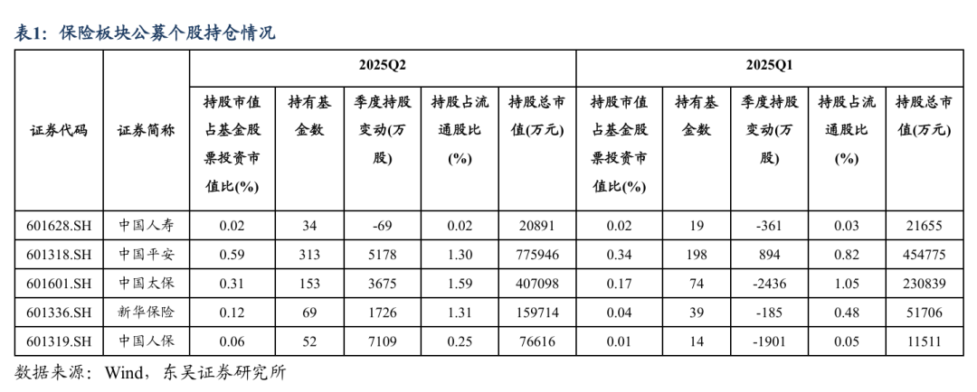 上市险企除国寿外均获增持,其中人保、平安增持较多:截至2025年Q2末,保险板块持仓为1.10%,较Q1末大幅提升0.53pct。Q2末保险动态估值为0.67x PEV,较Q1末提升0.07pct。公司方面,从持股数量上看,除国寿外均有所增持,其中人保、平安增持较多,分别为7109万股、5178万股,太保则增持3675万股;从持仓比例上看,平安、太保、新华和人保分别较Q1末提升0.26pct、0.14pct、0.08pct、0.05pct,国寿基本持平。2025年Q2末国寿、平安、太保、新华、人保的持仓分别为0.02%、0.59%、0.31%、0.12%、0.06%。